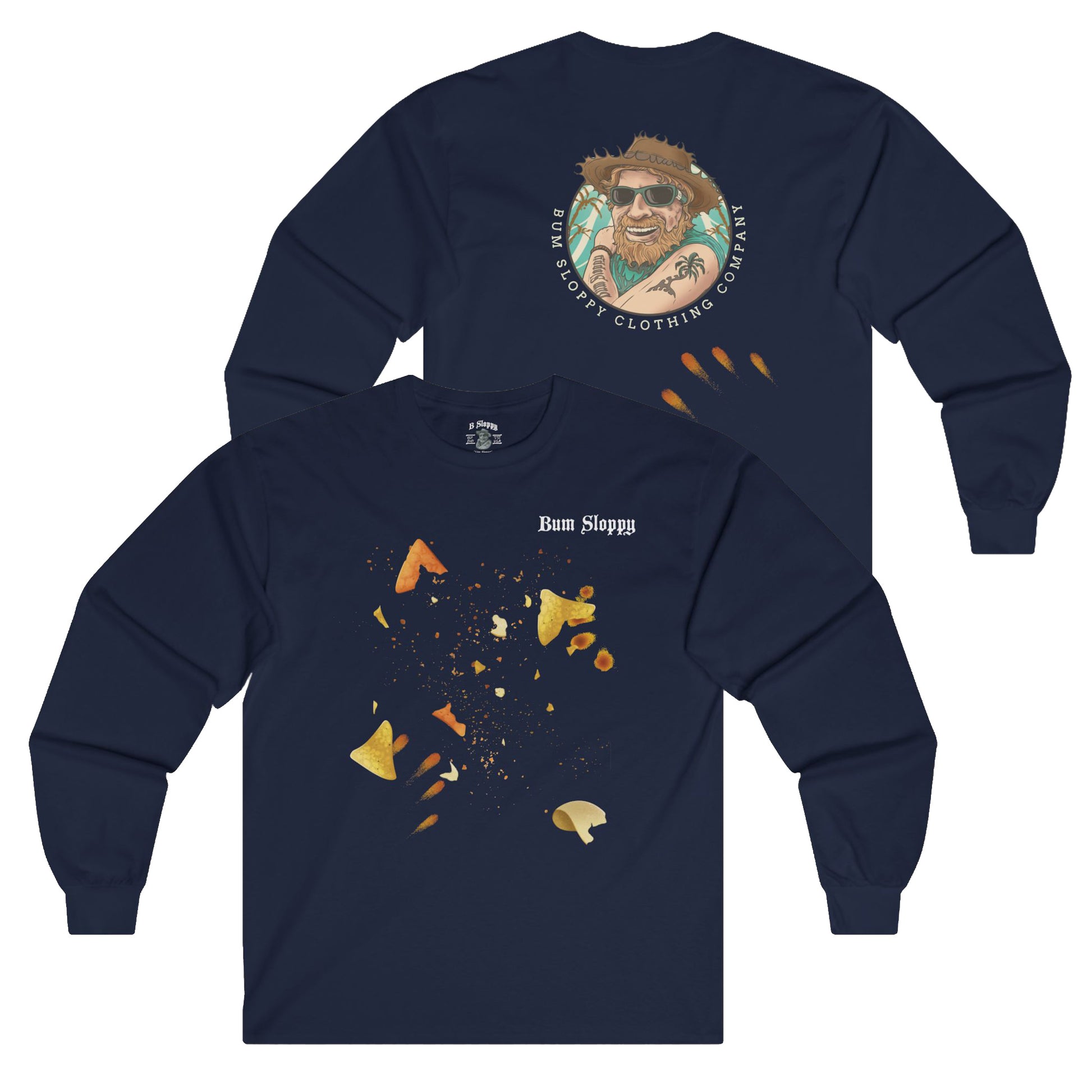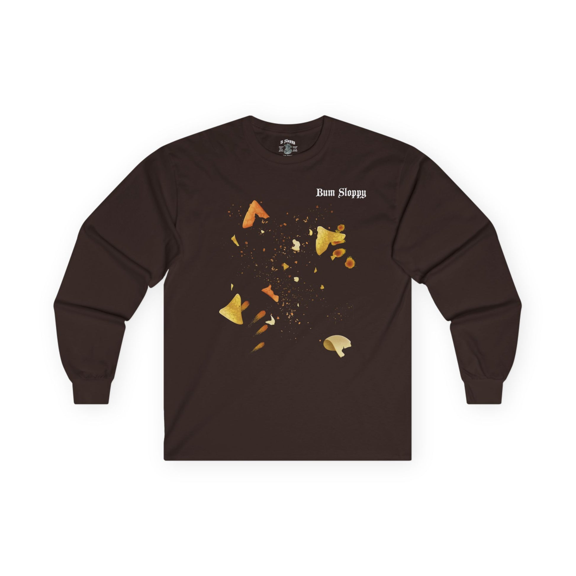 Chip crumbs... don't tell us you don't spill 'em. Wear this soon to be classic long sleeve tee when you're eating your favorite chips and nobody will notice a crumb or fourteen. We're Bum Sloppy and our unisex long sleeve tee fits like a well-loved favorite that you'll want to wear over and over and over. Casually elegant with an excellent quality print, it is an irreplaceable everyday item for anyone. Long sleeves help keep your blood warm in cold weather. Comes in White, Black, Navy, Ash, & Dark Chocolate. Wear your crumbs with pride!