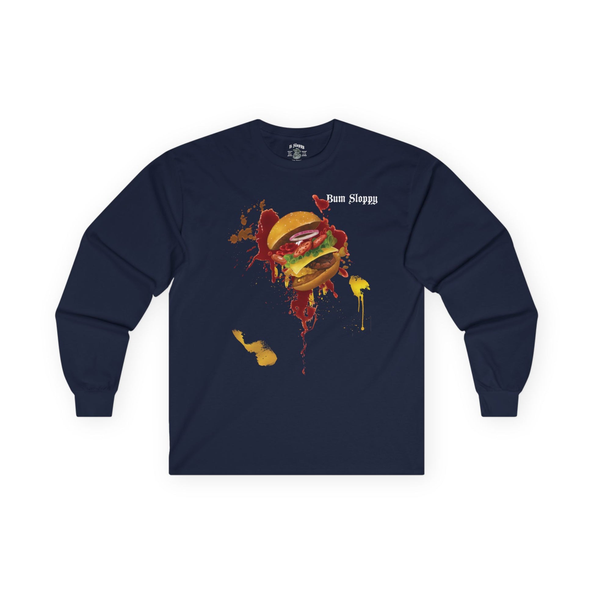 If your burger isn't sloppy, then you dont have enough stuff on it. Wear this soon to be classic long sleeve tee when you're eating America's favorite meal and nobody will notice if you spill. We're Bum Sloppy and our unisex long sleeve tee fits like a well-loved favorite that you'll want to wear over and over and over. Casually elegant with an excellent quality print, it is an irreplaceable everyday item for anyone. Long sleeves help keep your blood warm in cold weather. Comes in White, Black, Navy, Sport Grey, & Dark Chocolate. Wear and enjoy your food with pride!