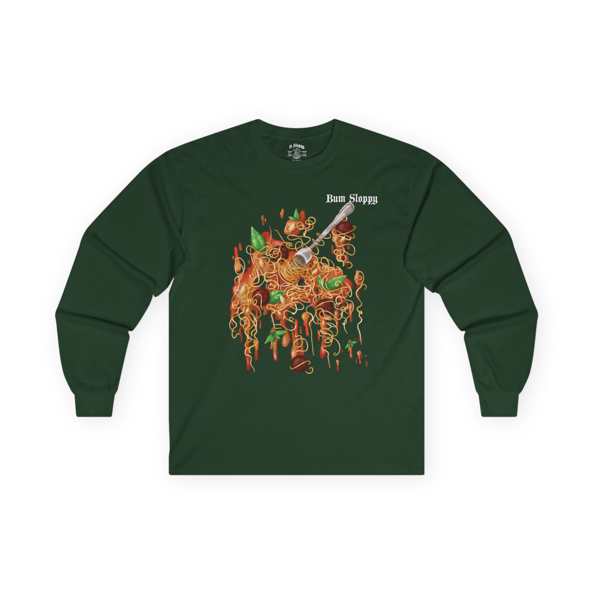 We're not sloppy, but pasta is super sloppy. Wear this soon to be classic long sleeve tee when you're eating pasta and nobody will notice if you spill. We're Bum Sloppy and our unisex long sleeve tee fits like a well-loved favorite that you'll want to wear over and over and over. Casually elegant with an excellent quality print, it is an irreplaceable everyday item for anyone. Long sleeves help keep your blood warm in cold weather. Comes in White, Black, Sport Grey, & Forest Green. Wear your food with pride!