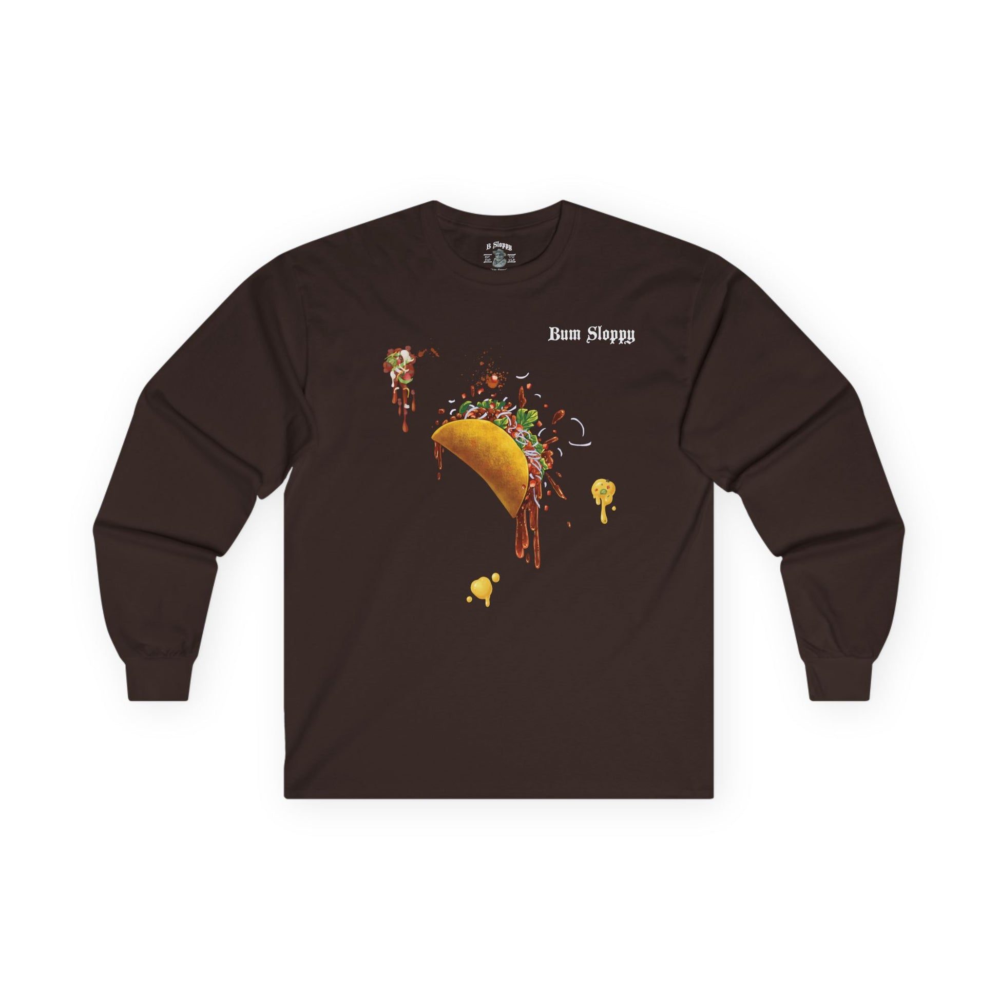 Taco! Taco! Taco! Need we say more? Wear this soon to be classic long sleeve tee just because and soak in the compliments (get it?). We're Bum Sloppy and our unisex long sleeve tee fits like a well-loved favorite that you'll want to wear over and over and over. Casually elegant with an excellent quality print, it is an irreplaceable everyday item for anyone. Long sleeves help keep your blood warm in cold weather. Comes in White, Ash, & Dark Chocolate. Wear your taco with pride! Heck, get another one for when this one is in the wash.